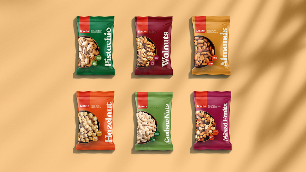 KoNuts is exactly what it sounds like: a retailer of every kind of nut, from peanuts, pistachios, pecans and pine nuts, to cashews, almonds and filberts, in salted, unsalted and organic varieties. The redesign incorporates this clean and honest tone of voice into the packaging with friendly typography and easy to read information.